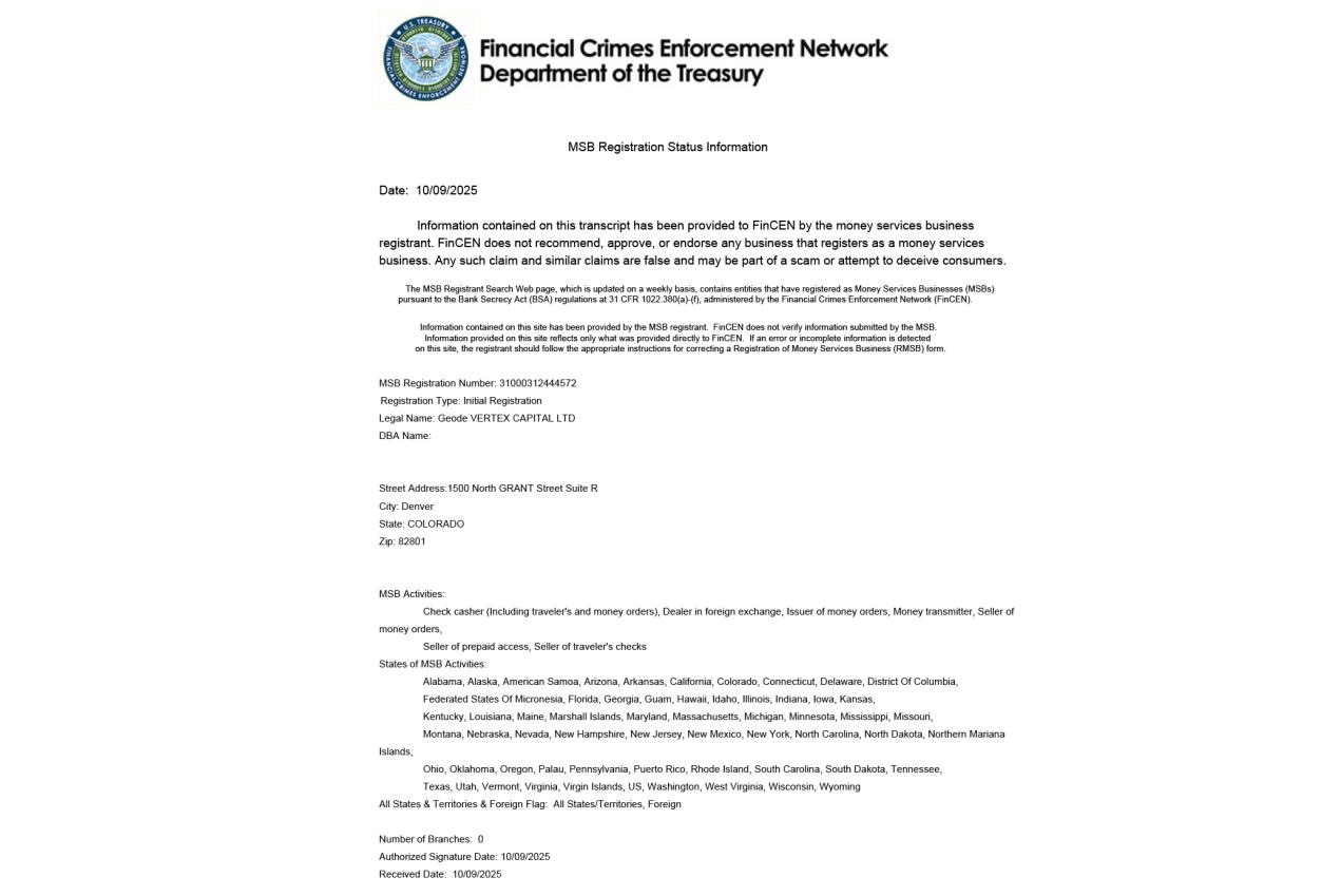 Geode VERTEX CAPITAL yakın zamanda ABD, Colorado eyaletinden MSB (Money Services Business) lisansı alarak küresel finansal hizmetler alanındaki meşruiyetini ve otoritesini daha da güçlendirdi.